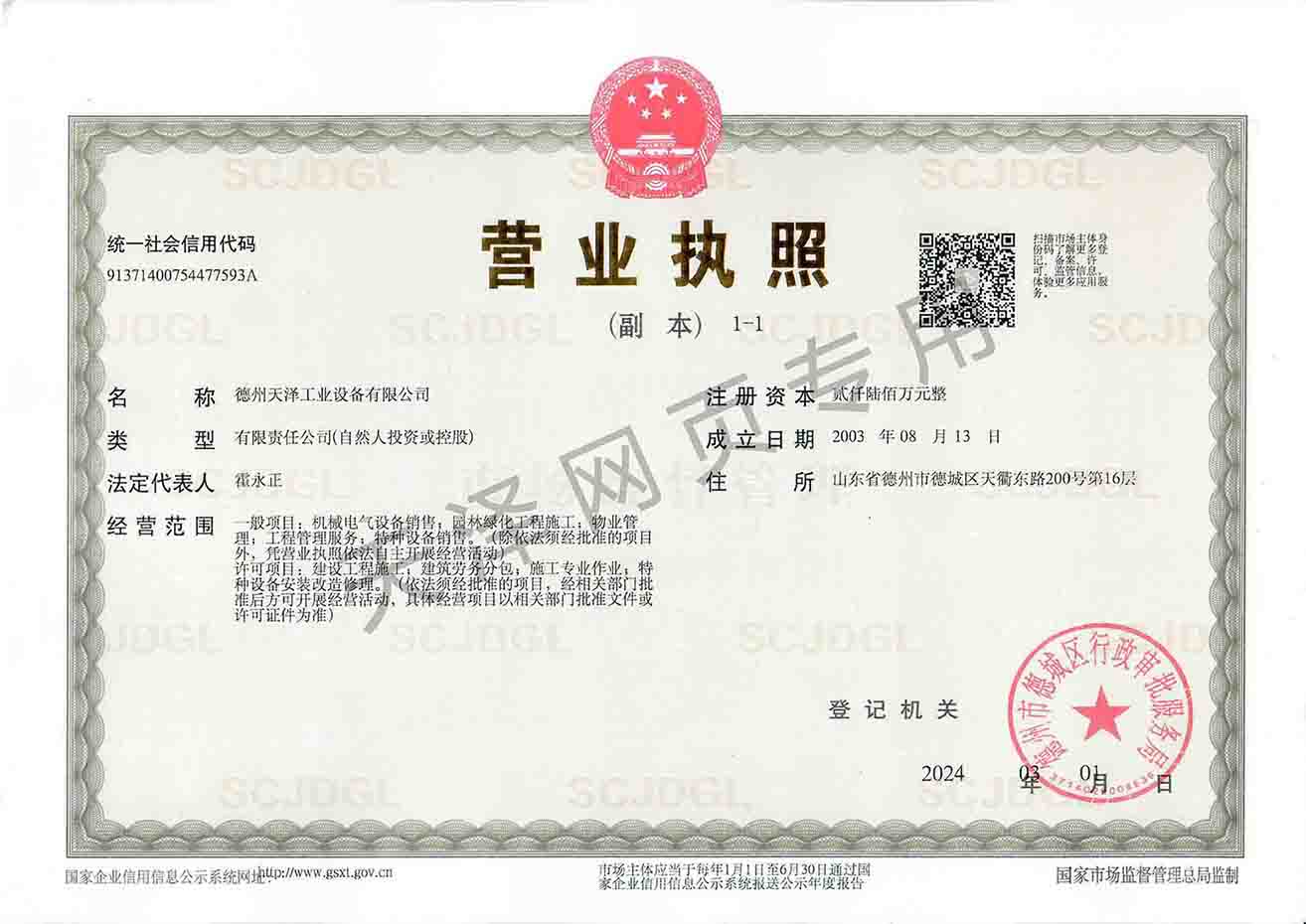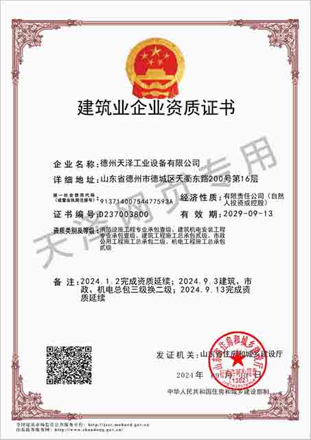 德州天澤工業(yè)設備有限公司成立于2003年(前身為德州天元集團天明工業(yè)設備安裝公司),經(jīng)過20多年的發(fā)展,現(xiàn)成長為擁有職工600余人,各類專業(yè)技術(shù)人員近300余人,年生產(chǎn)能力兩億元以上,以建筑機電安裝工程、消防設施安裝工程施工為主,集建筑工程施工、市政工程施工、建筑智能化工程施工、園林綠化工程施工、工程管理服務、物業(yè)管理、電氣機械設備銷售等多元化經(jīng)營于一體的綜合型企業(yè)。2005年,企業(yè)按照國際標準建立的質(zhì)量管理體系,通過了ISO質(zhì)量管理體系認證、環(huán)境管理體系認證、職業(yè)健康安全管理體系認證。施工工程遍布山東、河北、四川、江蘇等地,最具代表性的工程有:山東省德州市百腦匯資訊廣場機電安裝工程、德州經(jīng)濟開發(fā)區(qū)天元大廈機電安裝工程、陵城區(qū)人民醫(yī)院機電安裝工程、德州金魯班大廈機電安裝工程、河北故城金辰小區(qū)機電安裝工程、北川地震災后援建工程等。多年來,公司始終堅持“以人為本,建精品工程,創(chuàng)行業(yè)品牌”的經(jīng)營理念,先后榮獲。ㄊ校┘壧┥奖、天府杯、魯安杯等獎項,申報各種功法、多項專利。